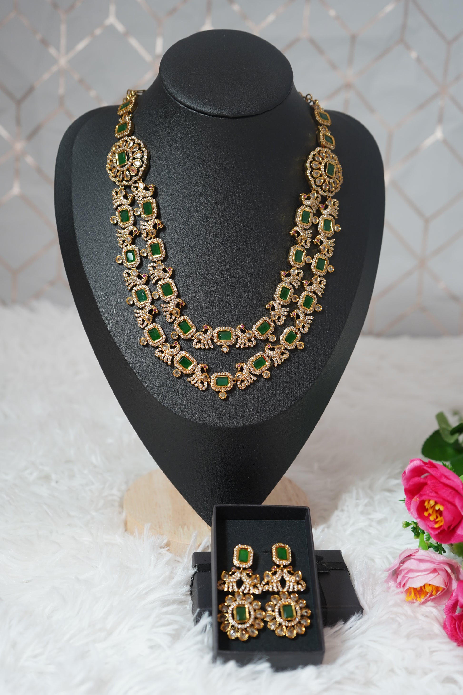 Elegant 2-layered long necklace set in green, finished with victorian polish