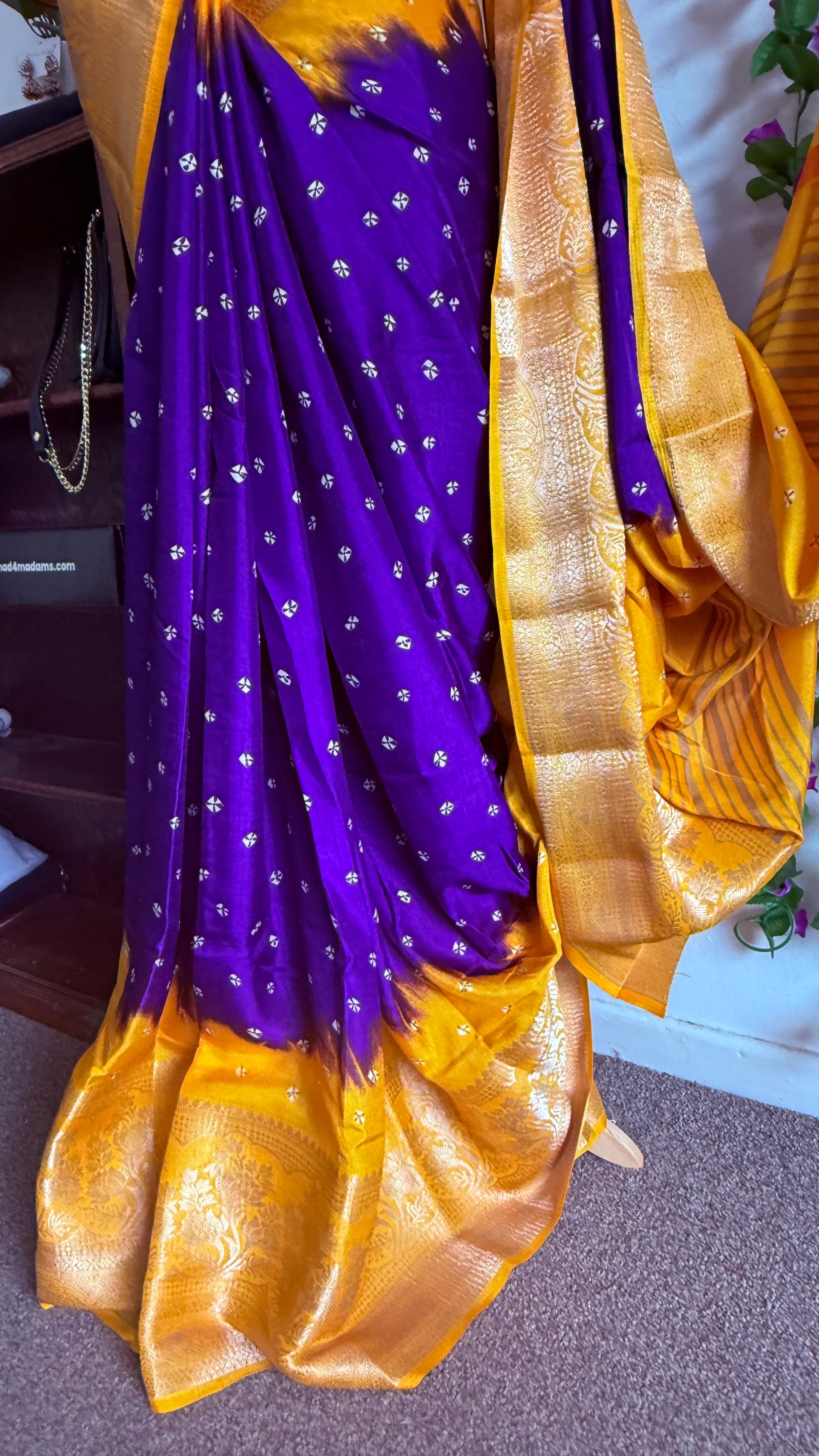 Beautiful Bandhani Dola Silk saree, designed in a vibrant dual-shade of blue and orange. The traditional Bandhani print blends beautifully with the rich texture of Dola Silk, giving it a luxurious and festive look.