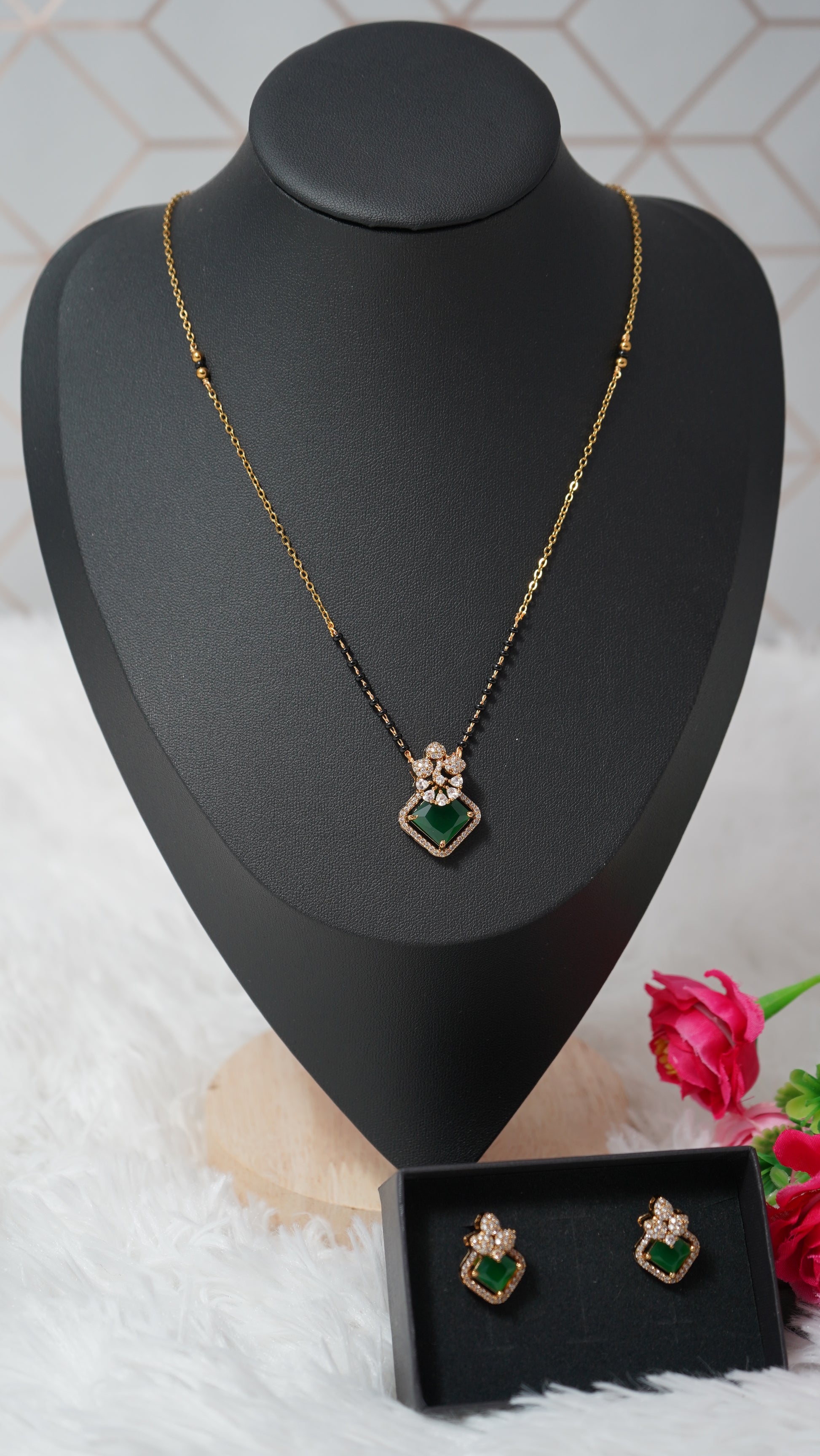 Beautiful short mangalsutra chain featuring black beads and green accents with Ear tops