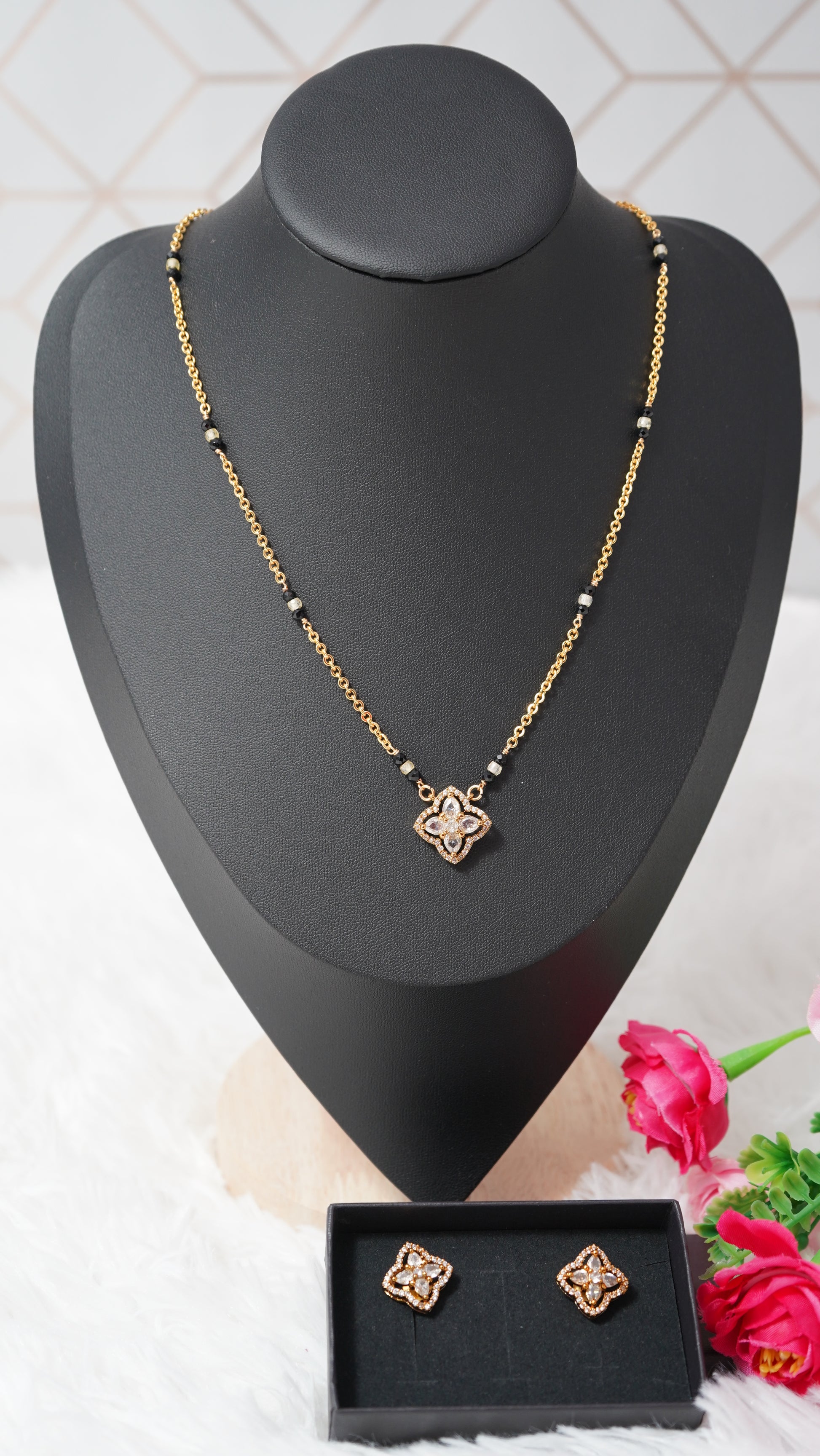 Short mangalsutra style chain set in micro gold plating, black beads with Ear tops