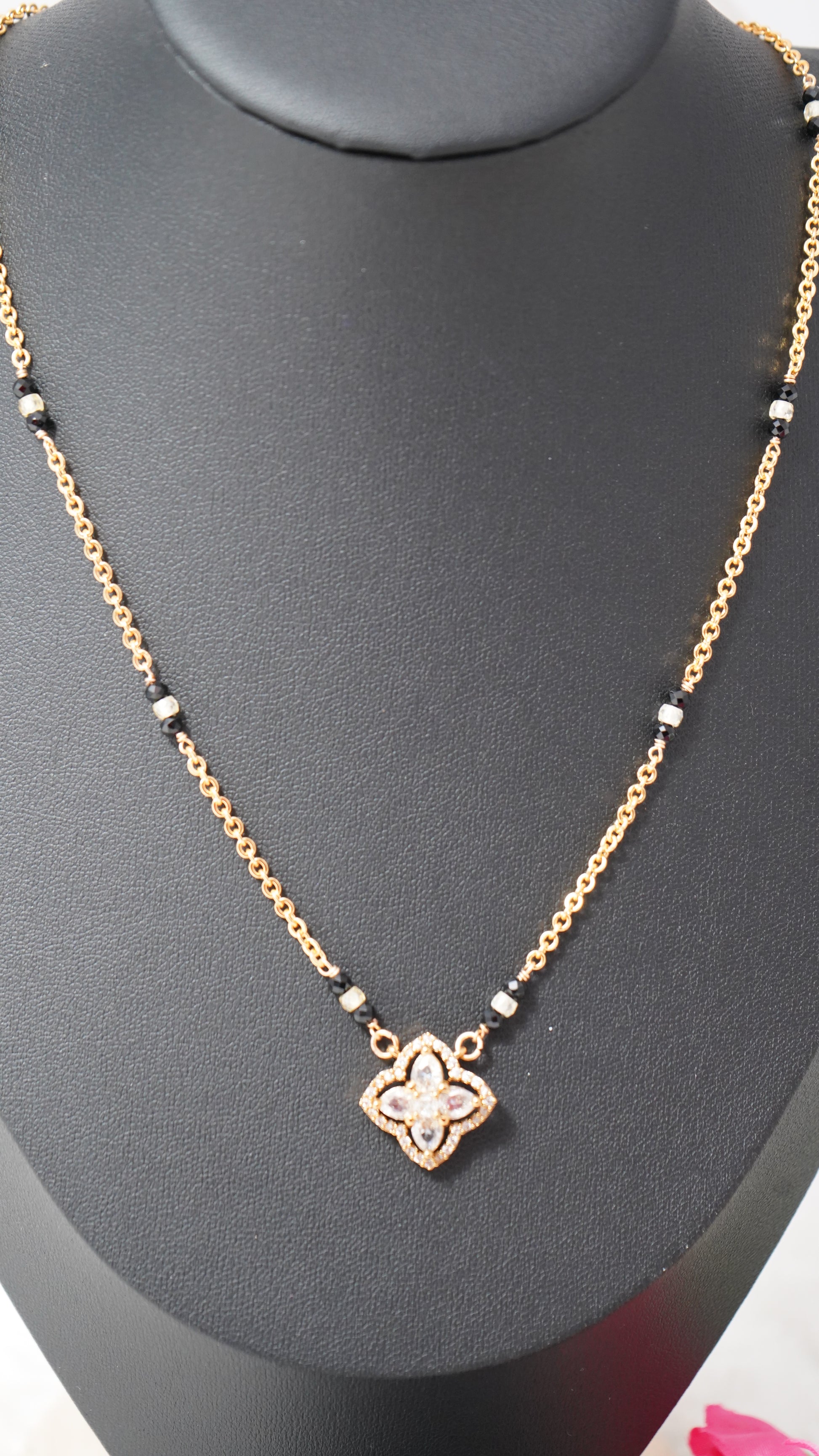 A classic short mangalsutra-style chain set in micro gold plating with black beads and green accents—versatile for daily wear and festive layering.