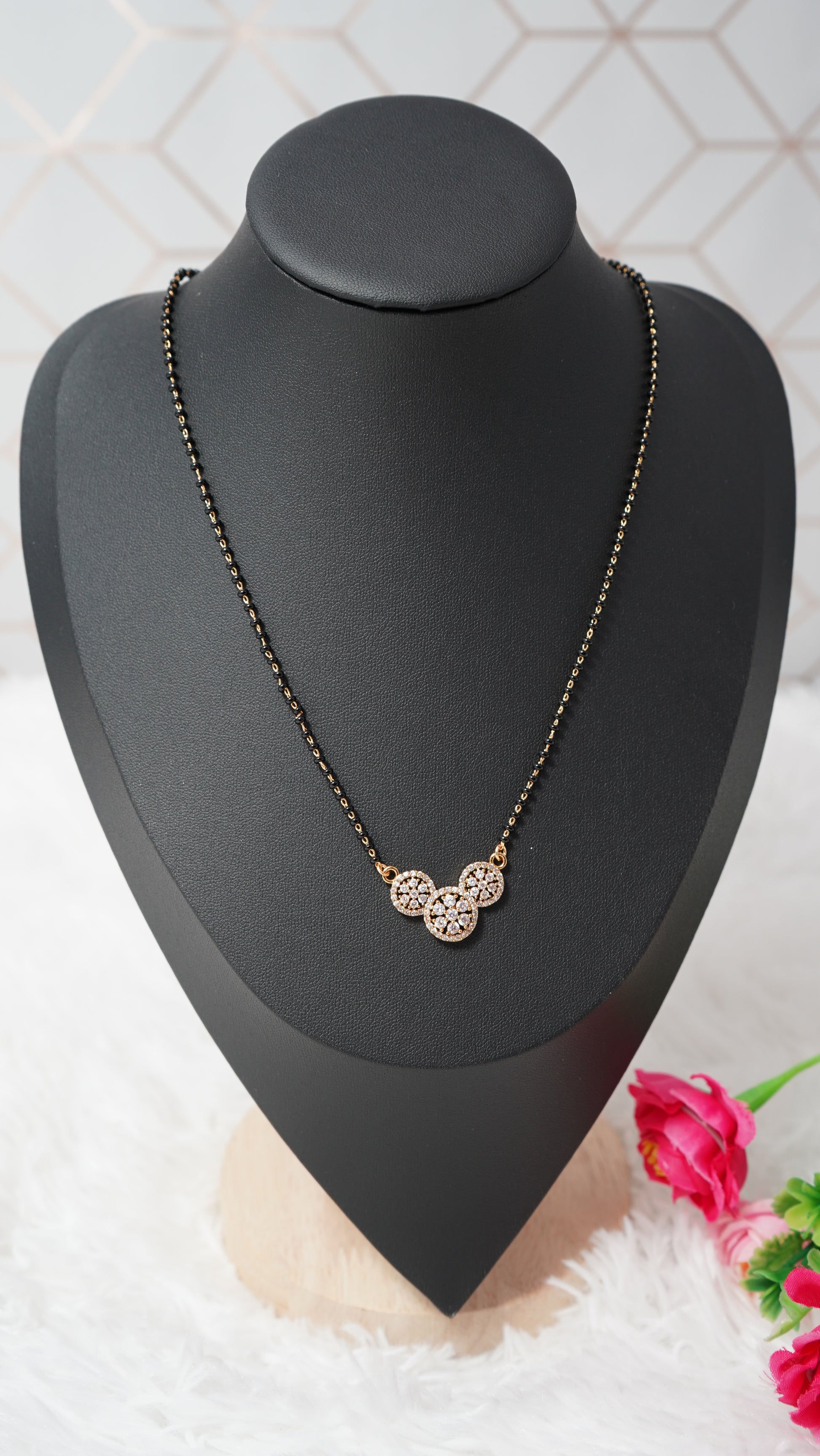 A stunning diamond replica mangalsutra featuring black beads and micro gold plating, accented with white stones for a refined and elegant look.