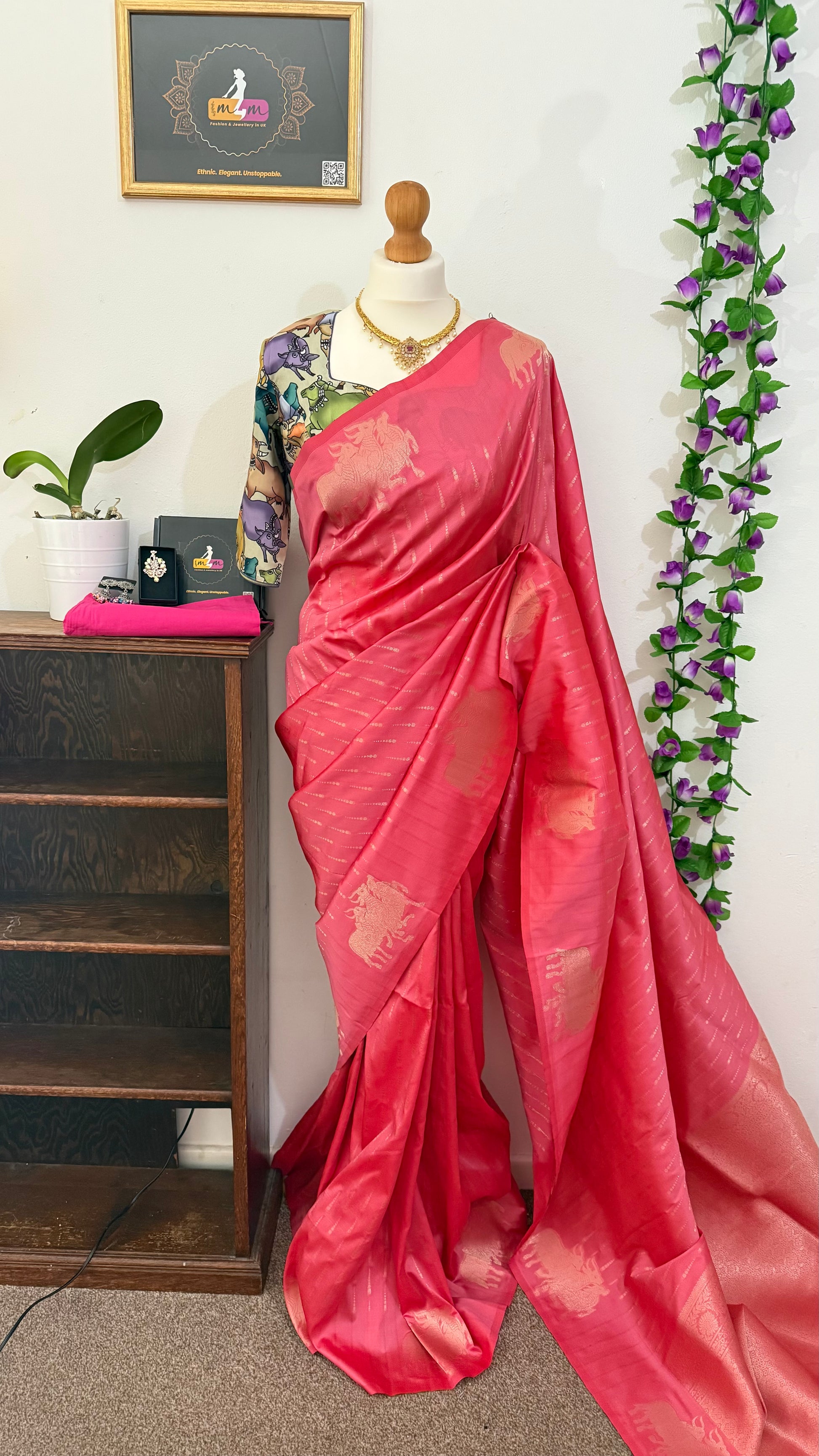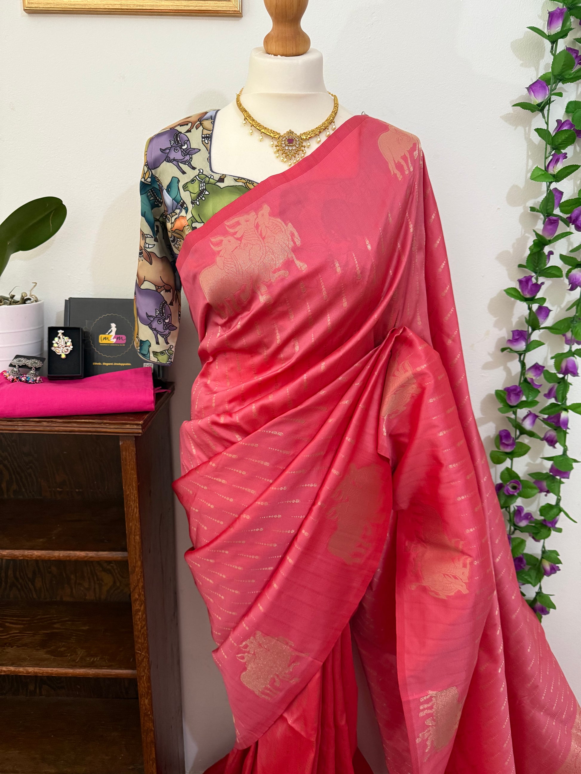 Dupion Silk Sarees with Animal Weaving- Contrast Stitched Blouse
