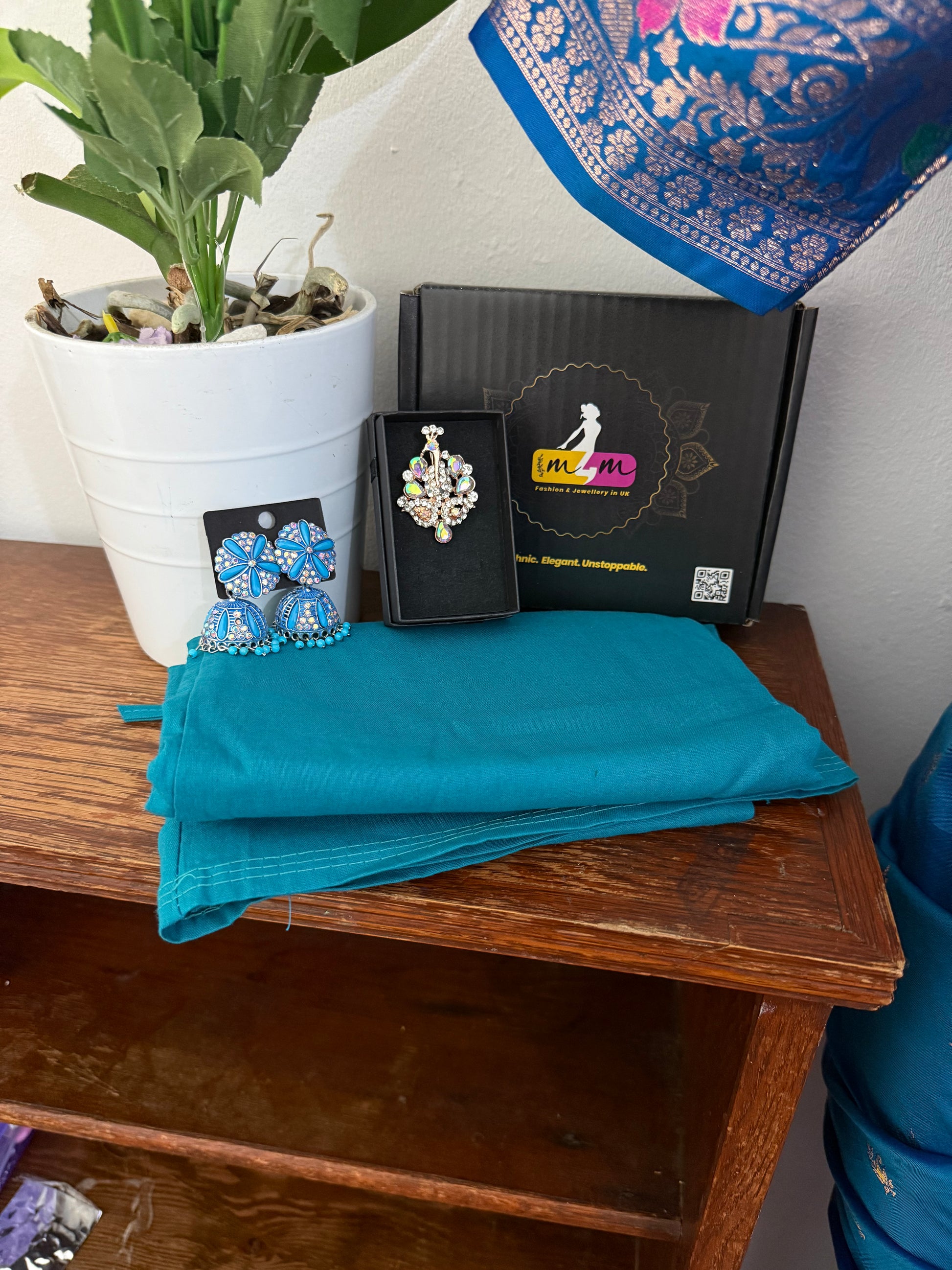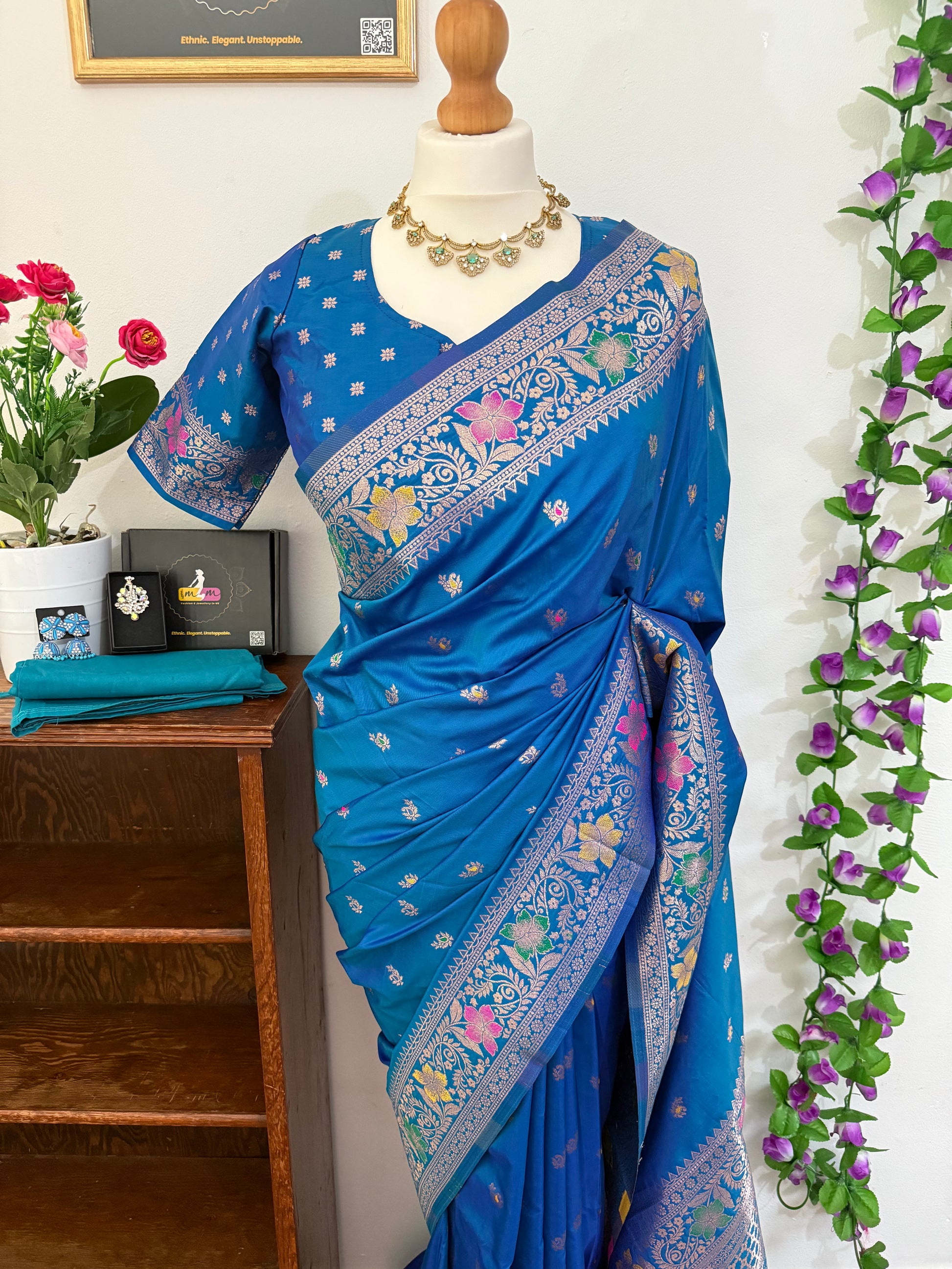 Step into timeless beauty with our Floral Banarasi Silk Woven Saree, paired with a perfectly stitched blouse & matching accessories.