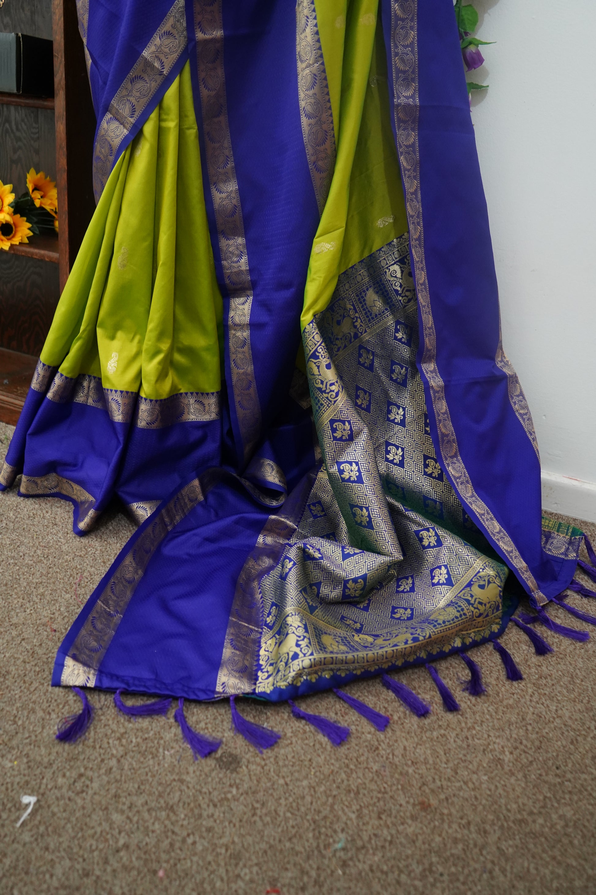 Lime green Semi Kanchi Gadwal saree with gold zari buttas and a rich royal blue border, blending traditional motifs with timeless South Indian craftsmanship.
