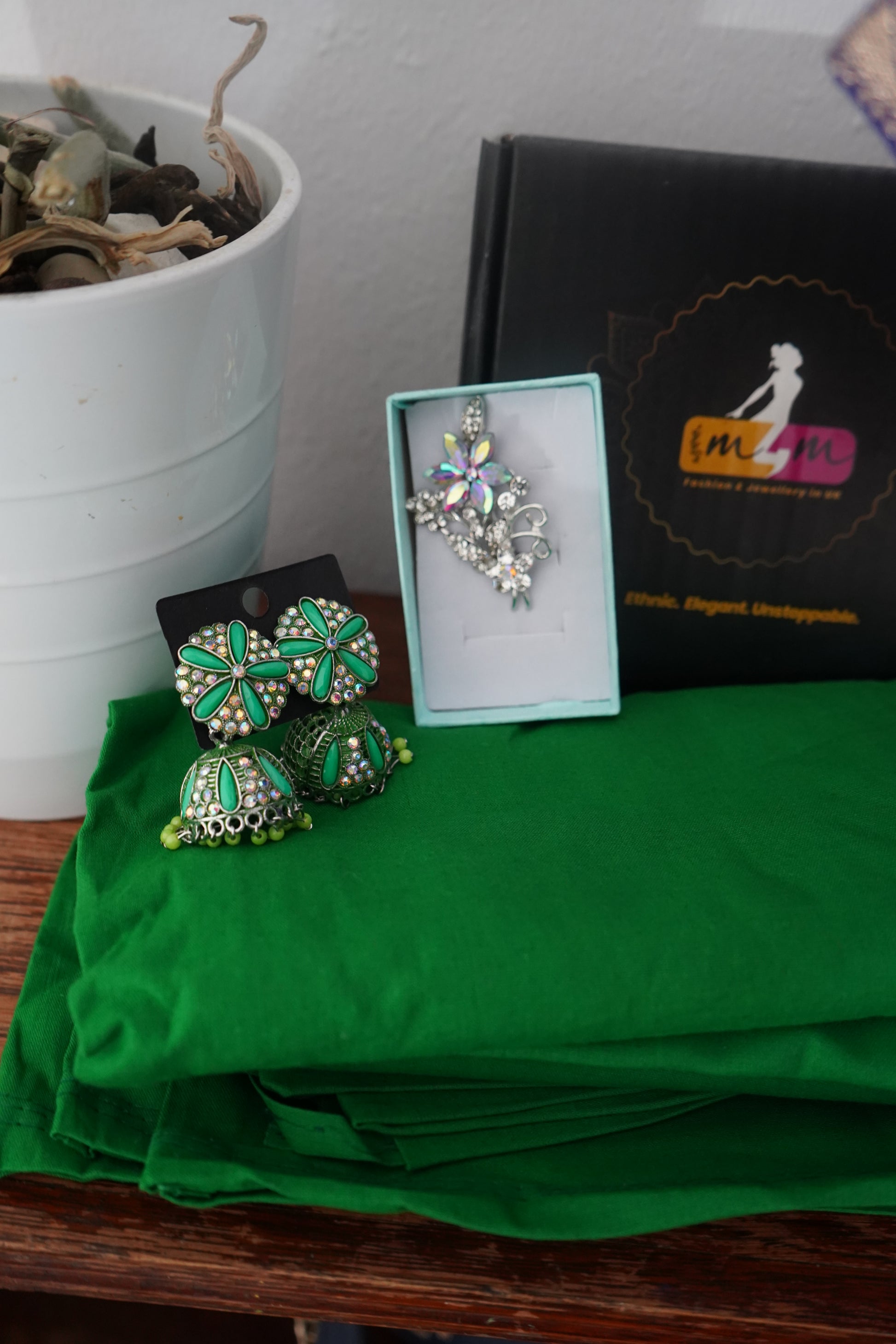 Semi kanchi gadwal gold zari buttas saree with stitched blouse - Green & royal blue border