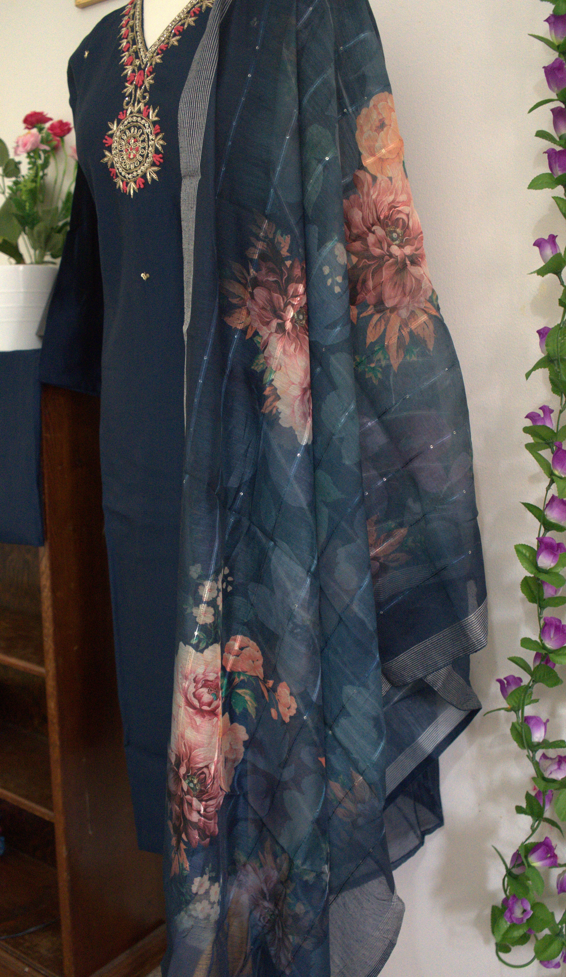 Semi Party Wear 3 piece set - Kurti, bottom and dupatta - Navi Blue
