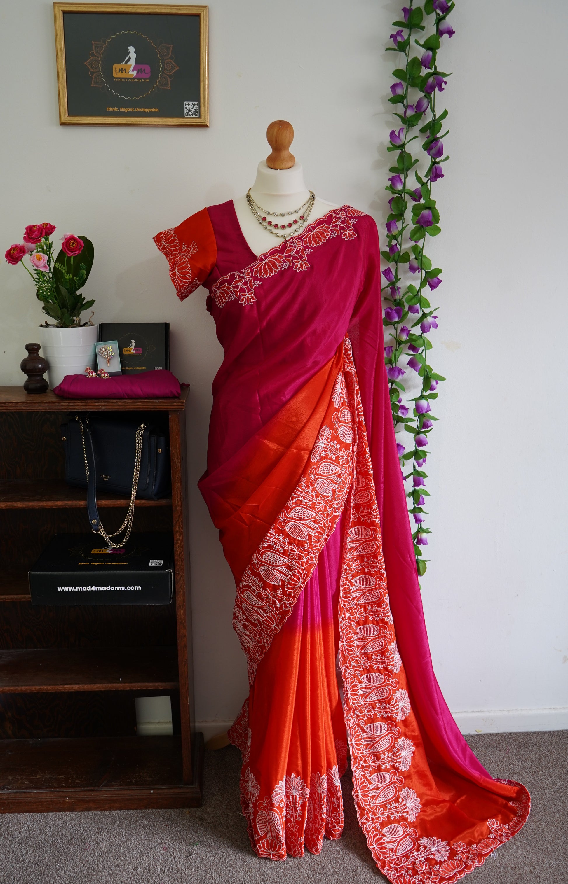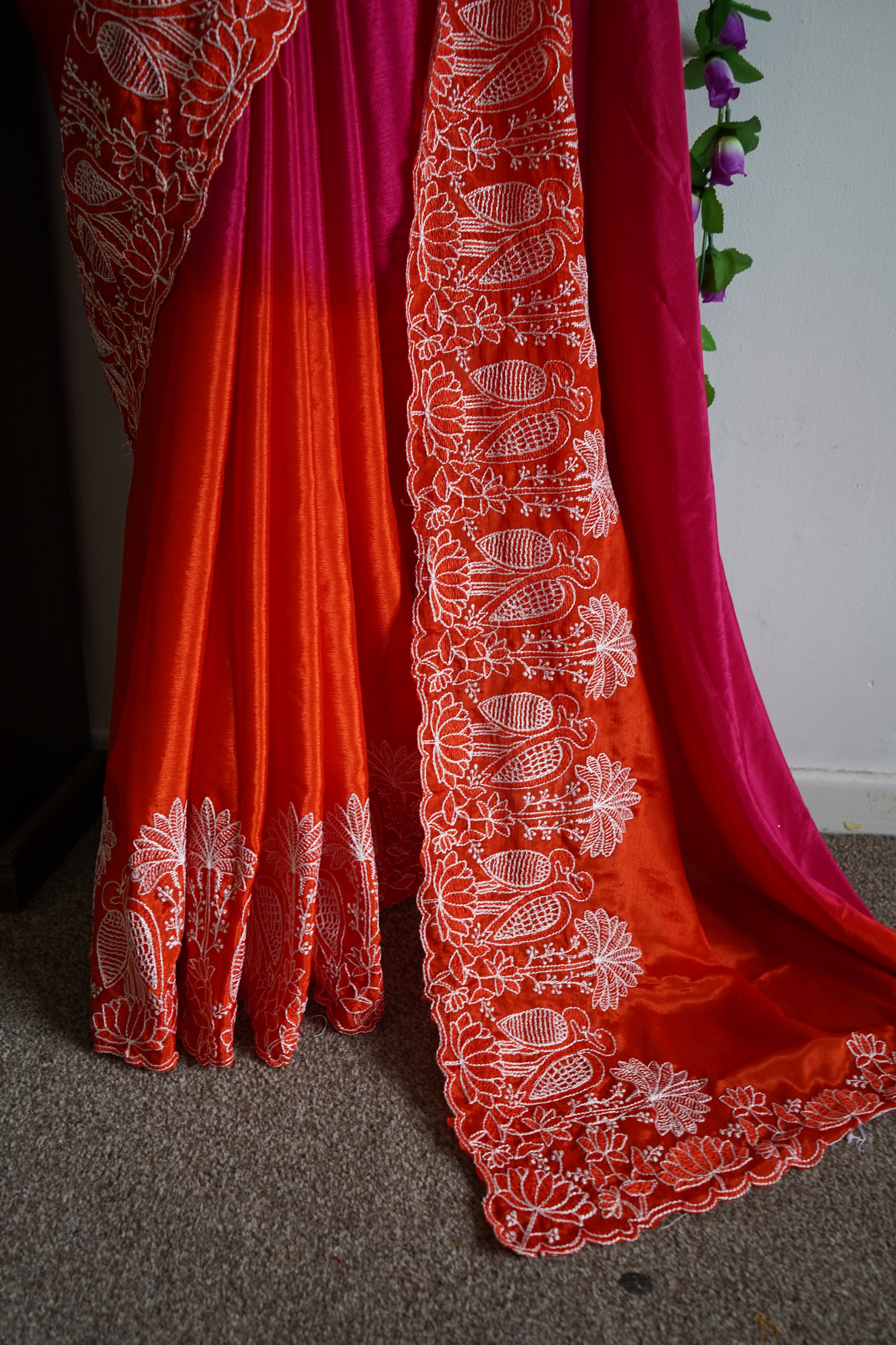 Beautiful viscose silk dual shade saree with stitched blouse - Pink & Orange with golden zari